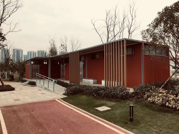 MORE拼裝廁所;在廠里做好各個廁所部件,再到現場組裝在一齊,適合不易運輸的大型廁所。這座箱式廁所,女廁5個蹲位內配工具間,男廁2個蹲位+2小便斗,第三衛生間由殘疾馬桶、助力洗手盆和兒童馬桶、兒童洗手盆外加嬰兒臺等設施。廁所前后有窗,通風采光,前部走廊裝有屋檐,防雨防曬。此廁所位于公路綠道邊,整體大氣,功能齊全,造型美觀,是一道難得的靚麗景觀!
